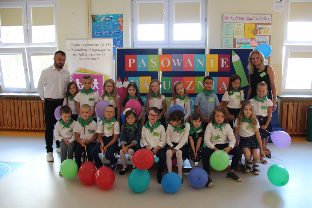 Na znak przynależności do społeczności SP114 wychowawcy klas pierwszych zawiązali swoim uczniom chusty z nazwą naszej szkoły zakupione z funduszu Rady Rodziców.