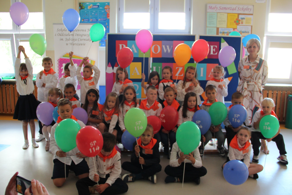Kolorowe balony z logo szkoły wywołały uśmiech na twarzach dzieci.