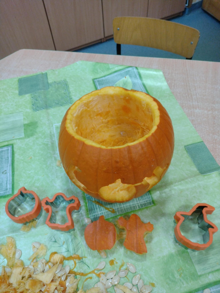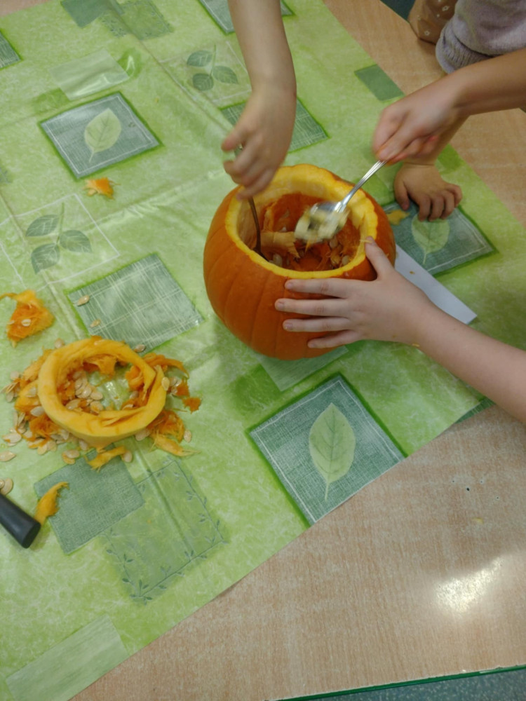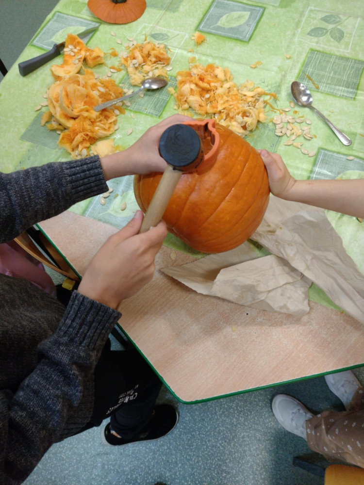 - Wspólnie wydrążały dynię, podziwiając jej niezwykłe wnętrze,