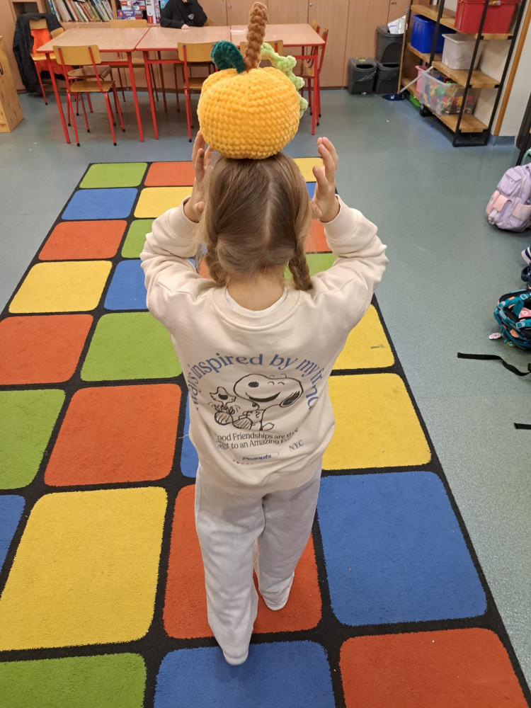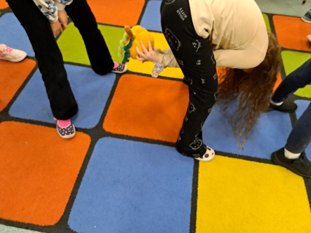 - A także świetnie się bawiły podczas zabaw ruchowych z pluszową dynią – chodziły z nią na głowie i przekazywały ją sobie w „dyniowym tunelu”!